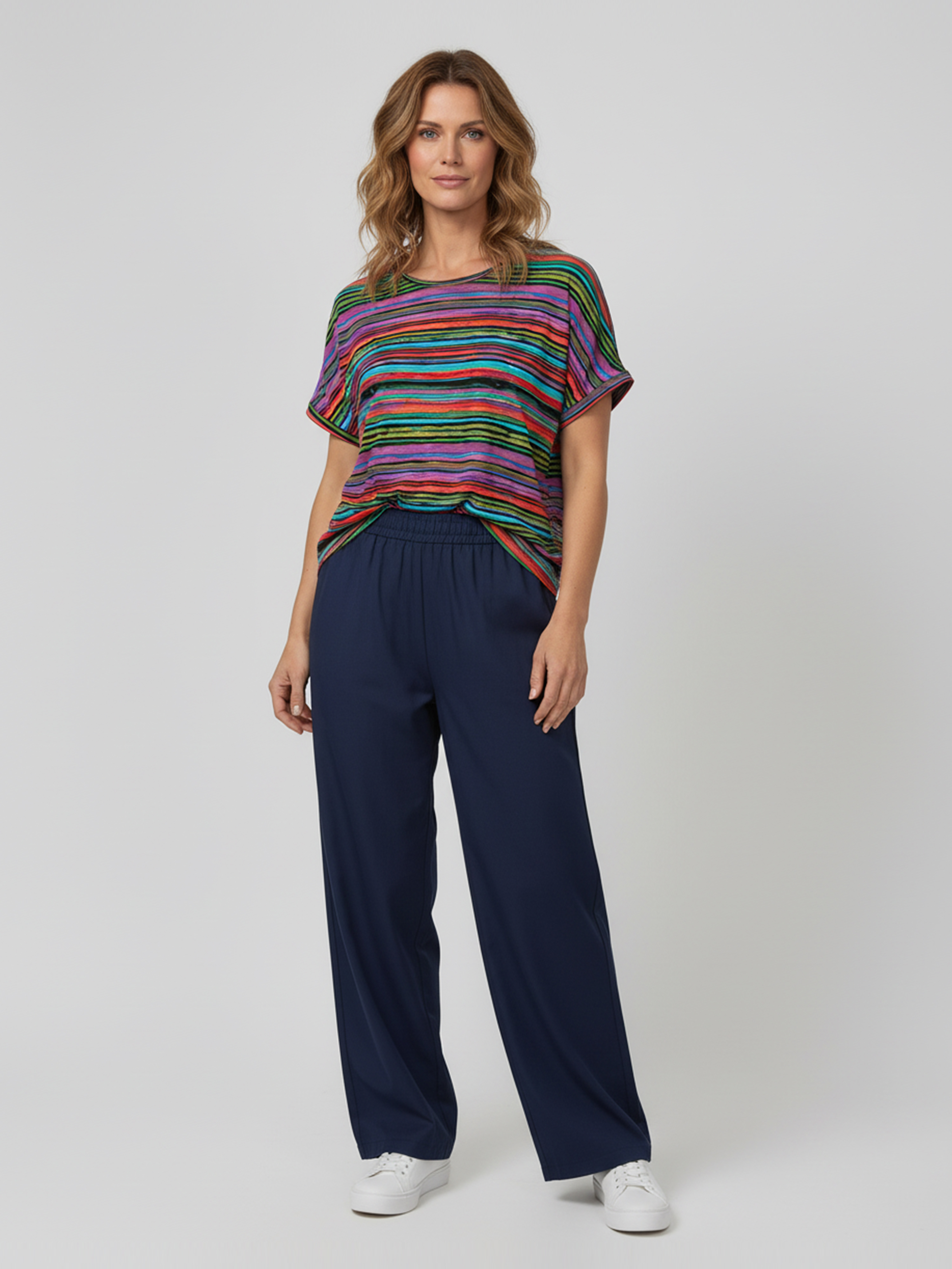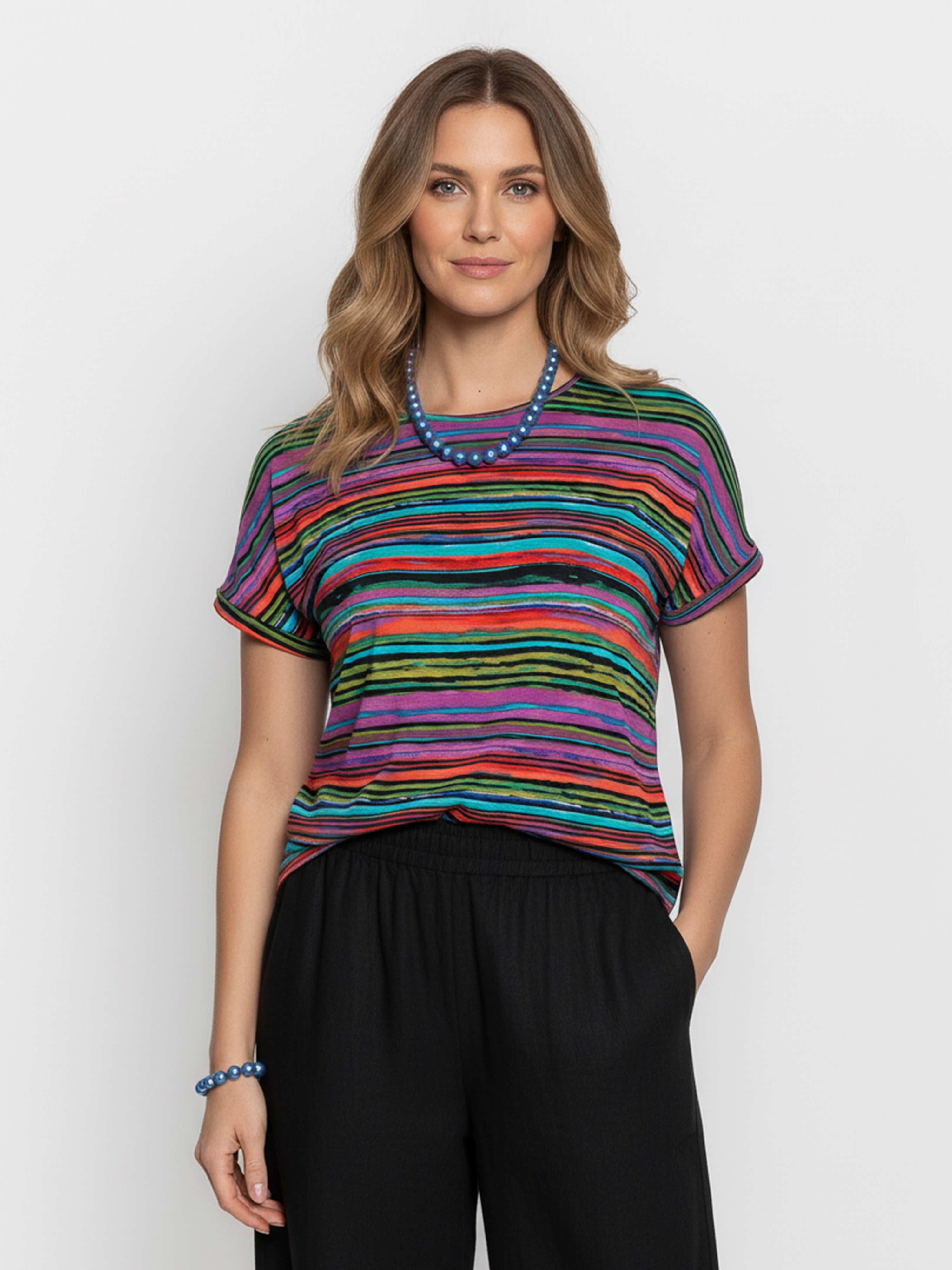 Bluzka z dzianiny w kolorowe, nieregularne paski to propozycja, która łączy w sobie modny design i komfort noszenia. Wzór w postaci pasków o różnych szerokościach i kolorach tworzy dynamiczną kompozycję, nadając bluzce nowoczesny i artystyczny charakter. Kolorowe pasy doskonale przyciągają wzrok, wprowadzając do stylizacji element świeżości i radości.
