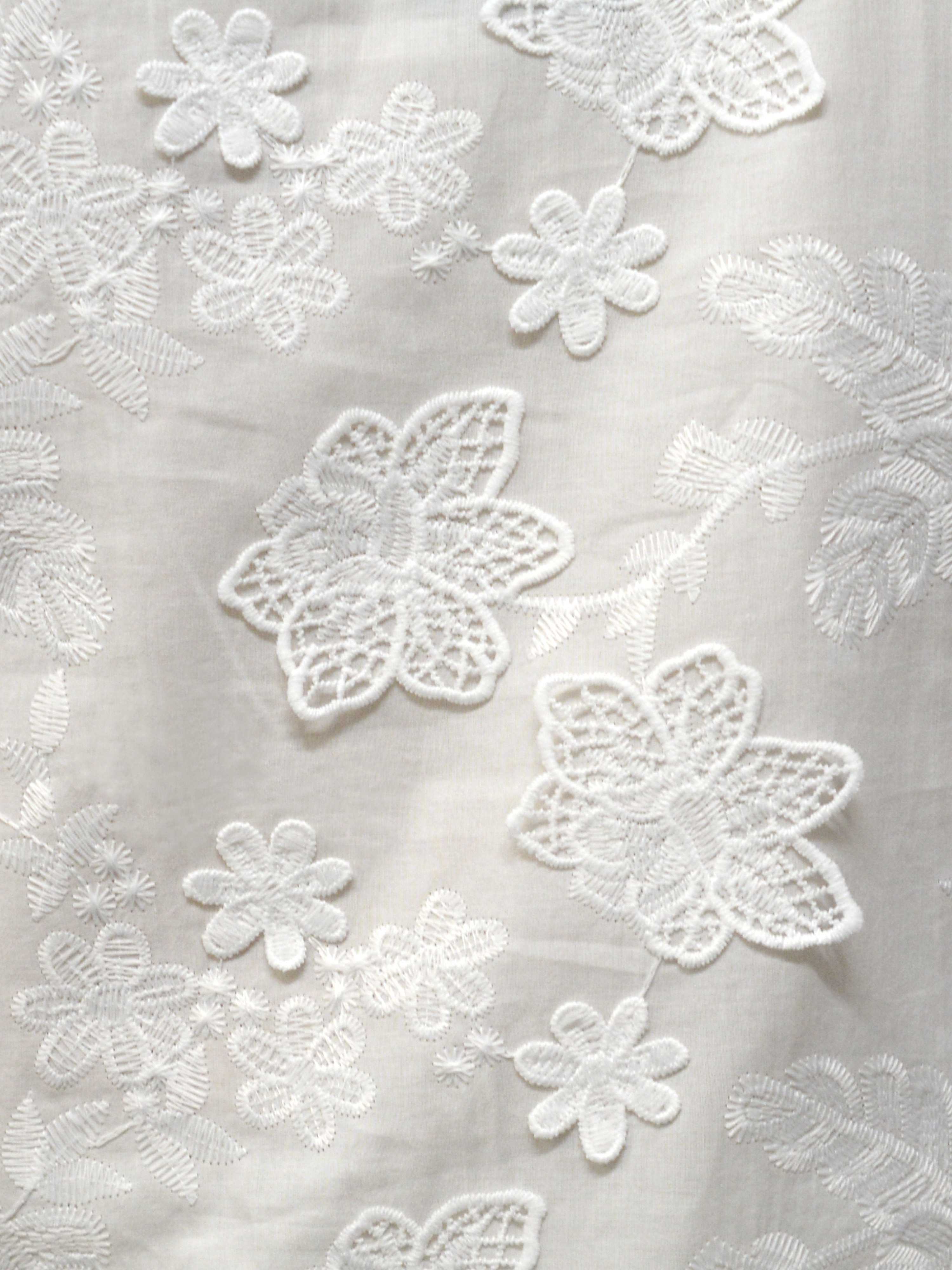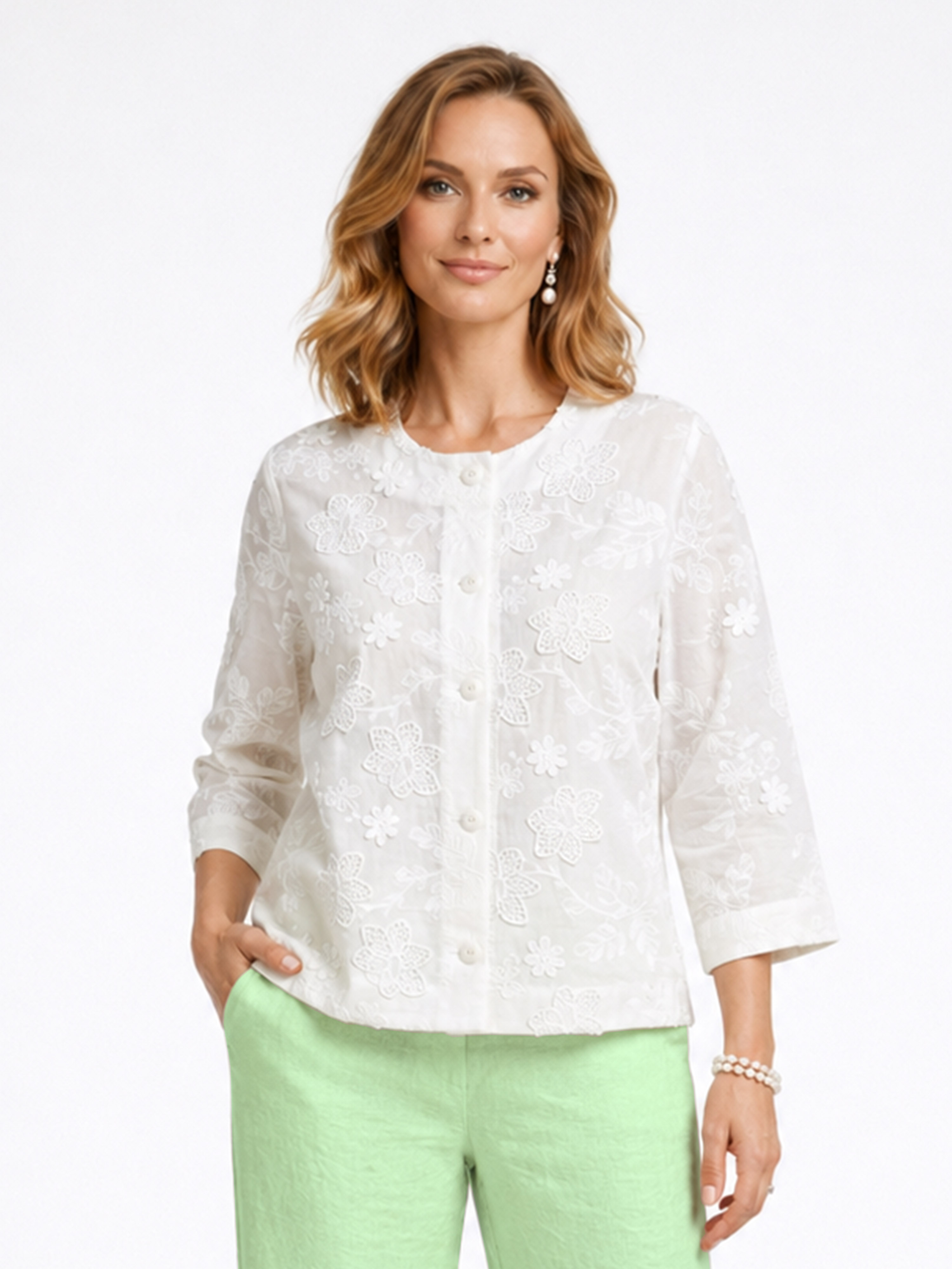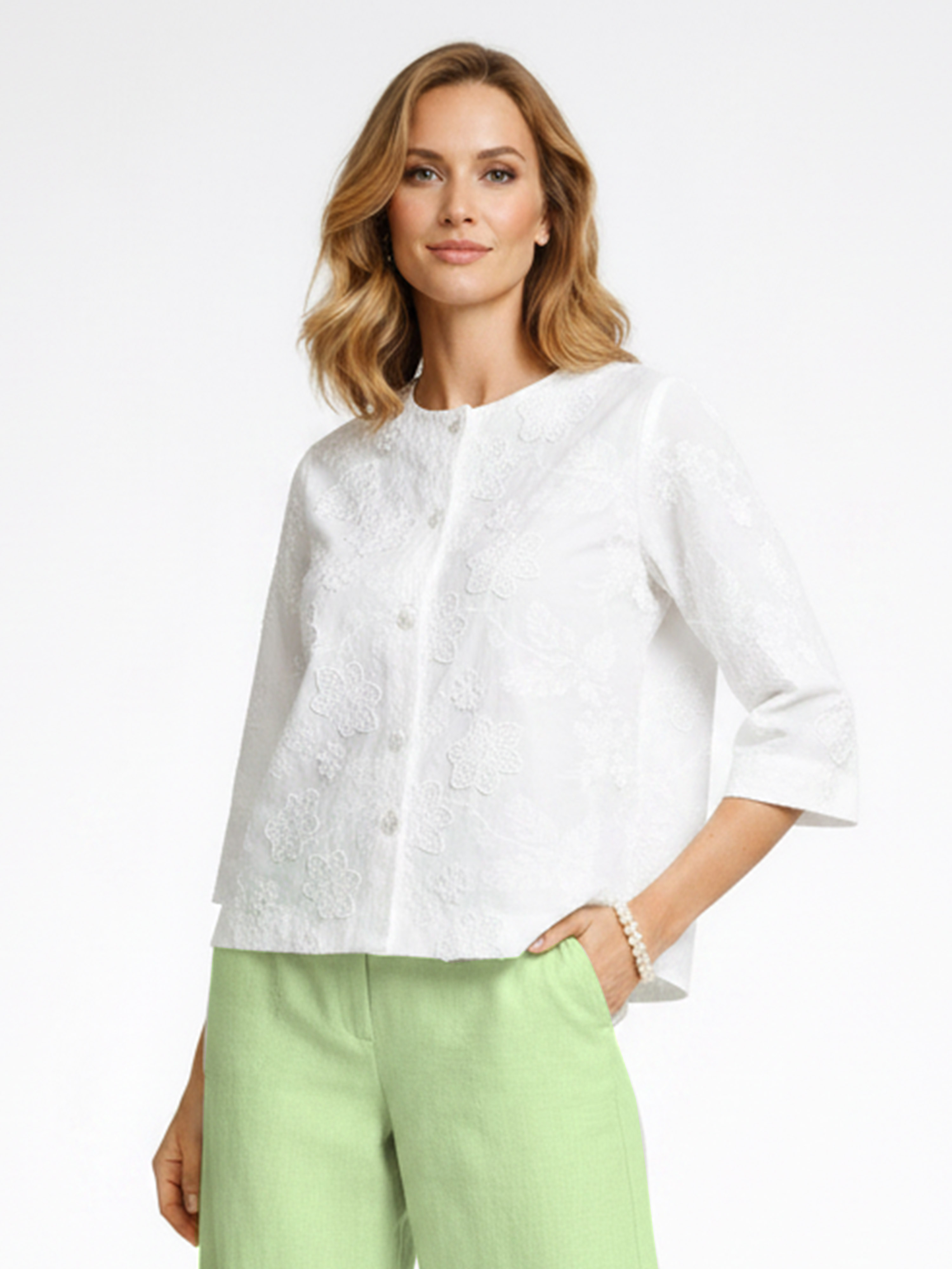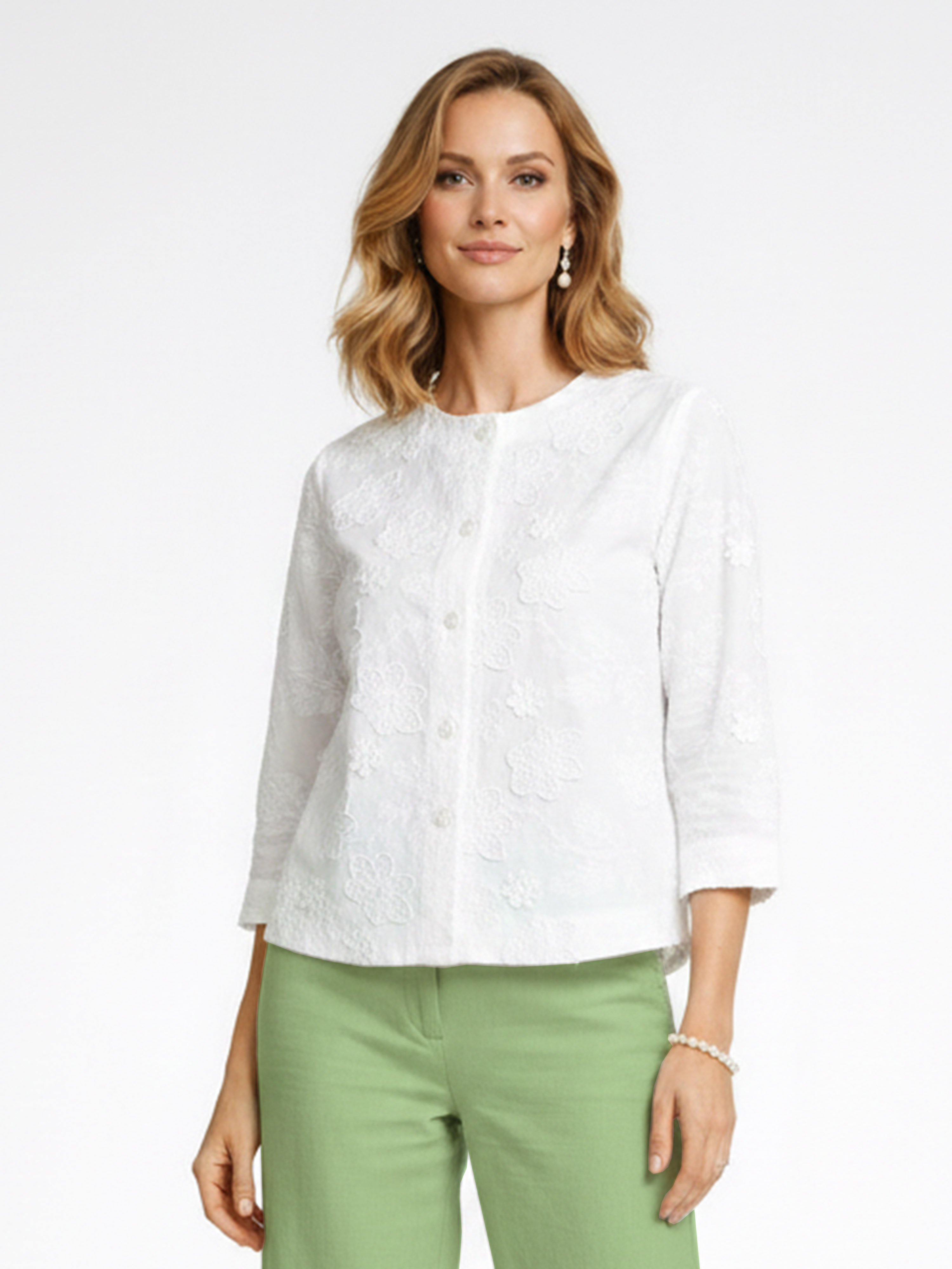 Eleganckie bolerko w białym kolorze zachwyca delikatnym, kobiecym charakterem. Wykonane z lekkiej tkaniny ozdobionej efektownym, wypukłym haftem w motywy kwiatowe, przyciąga uwagę i nadaje stylizacji wyjątkowej lekkości.