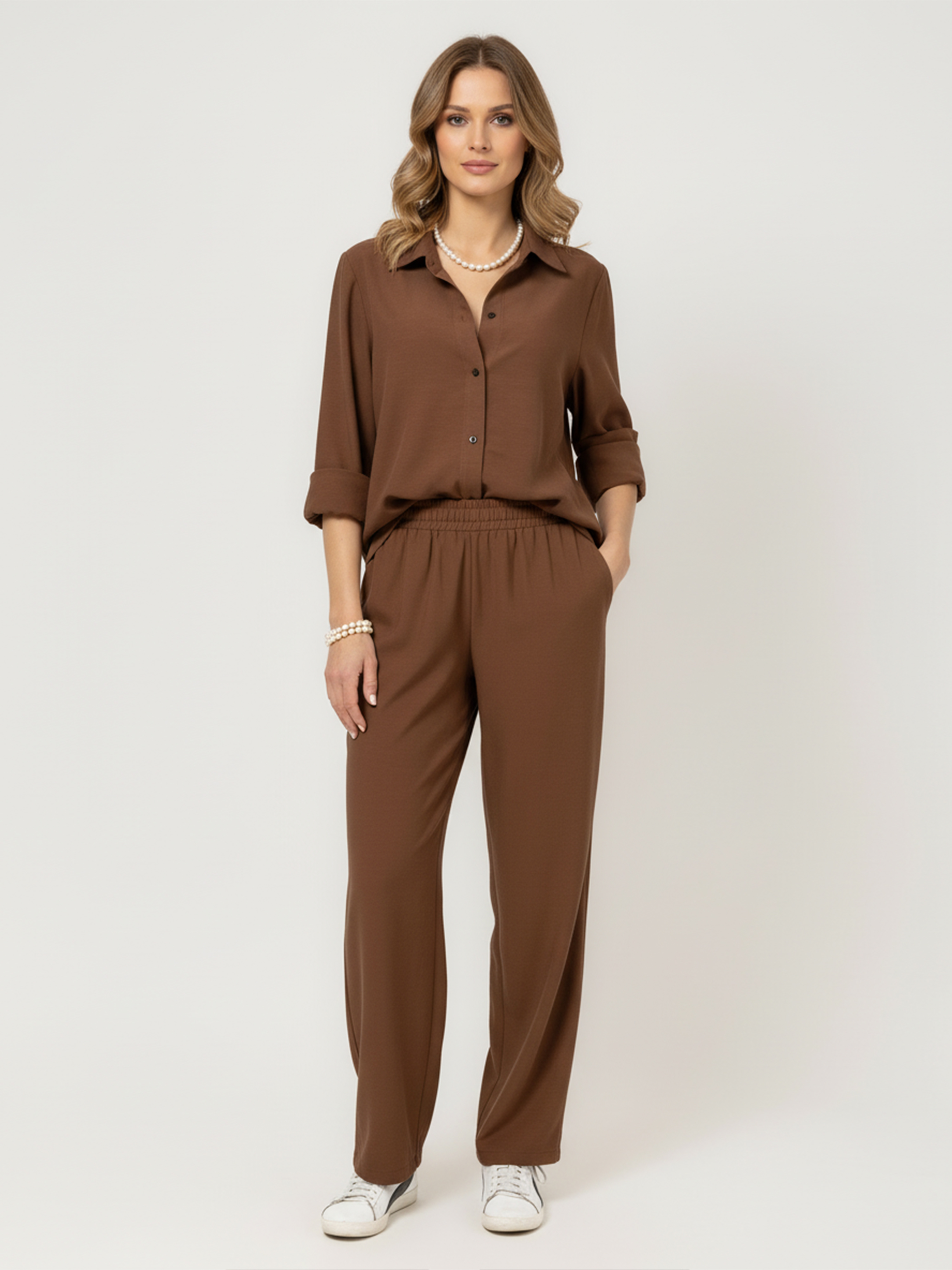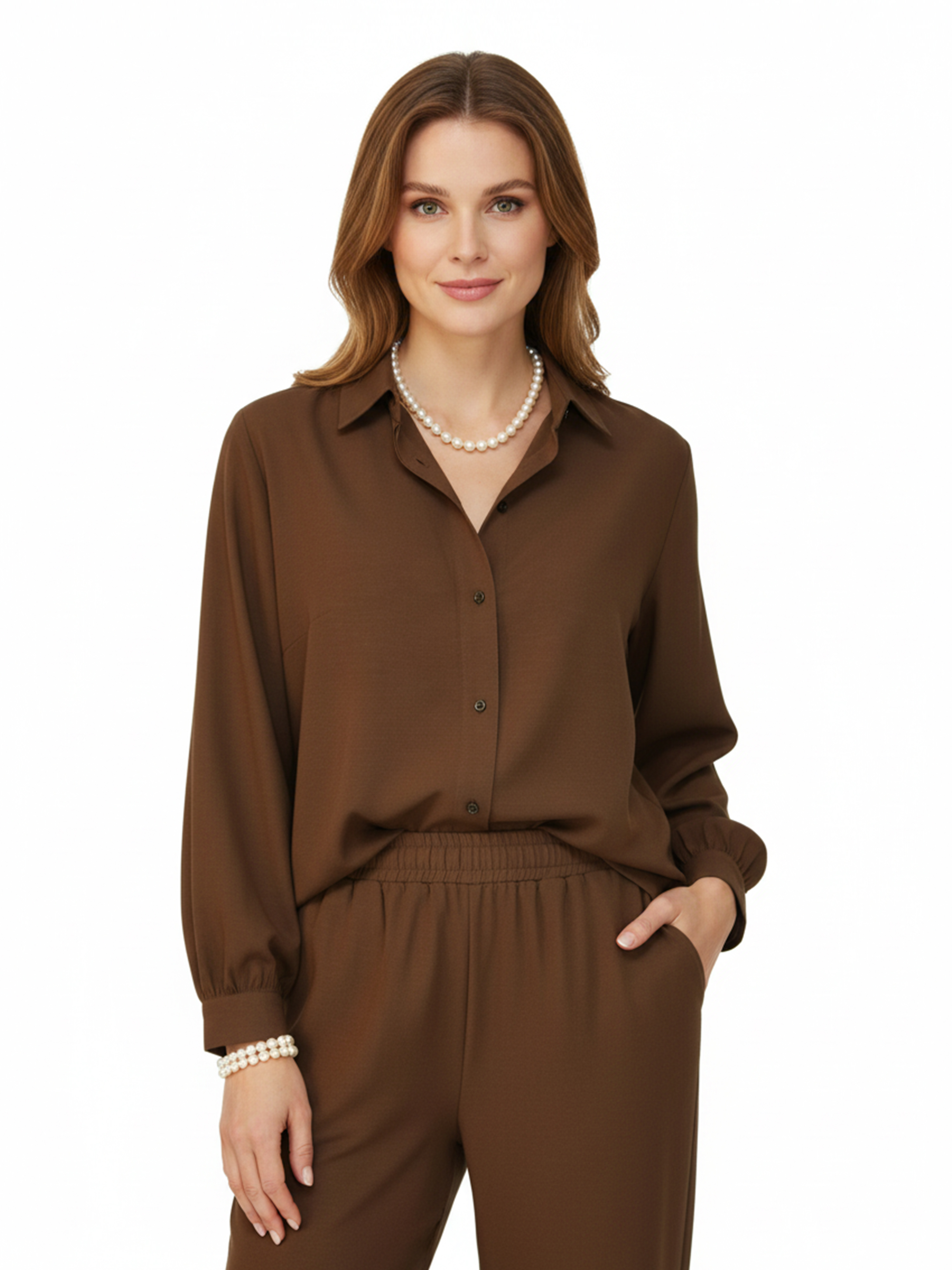 Bluzka koszulowa uszyta z wysokiej jakości tkaniny wiskozowej w ciepłym brązowym odcieniu, który nadaje jej elegancki i ponadczasowy wygląd.