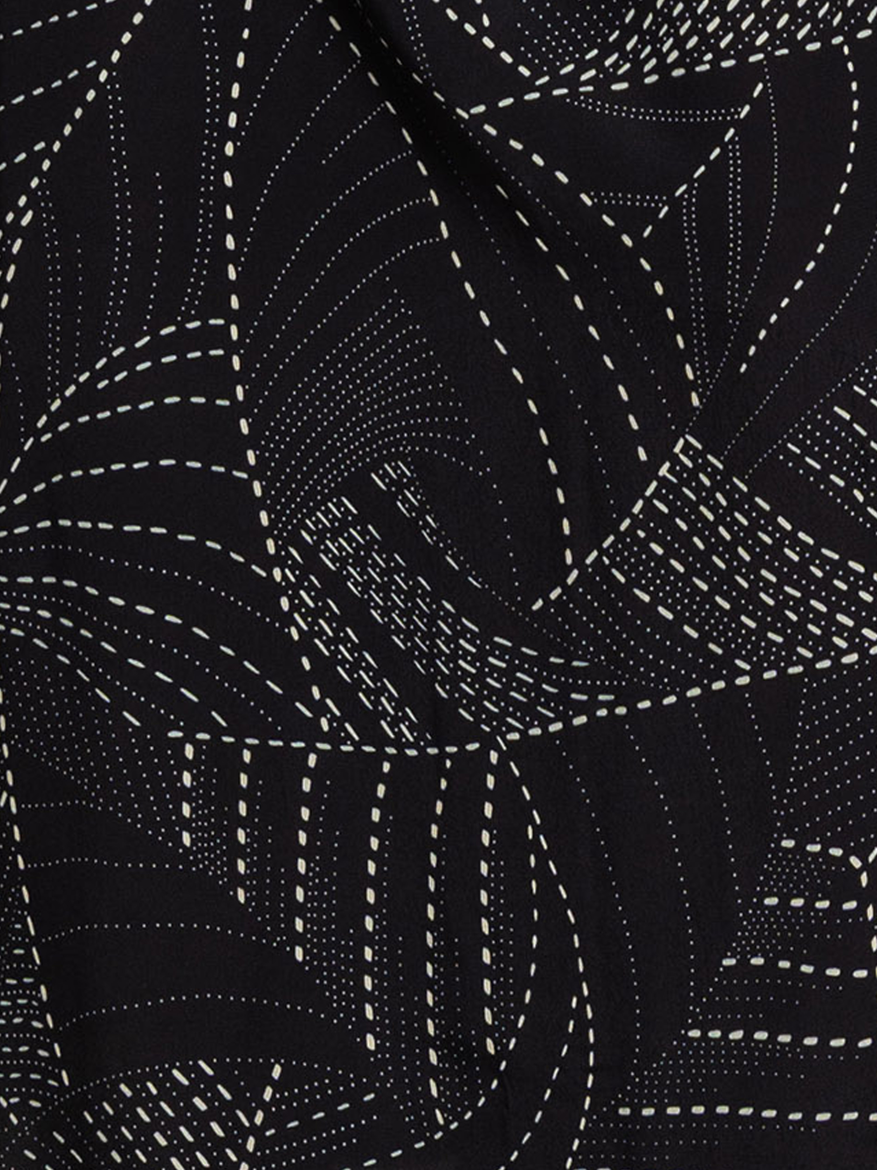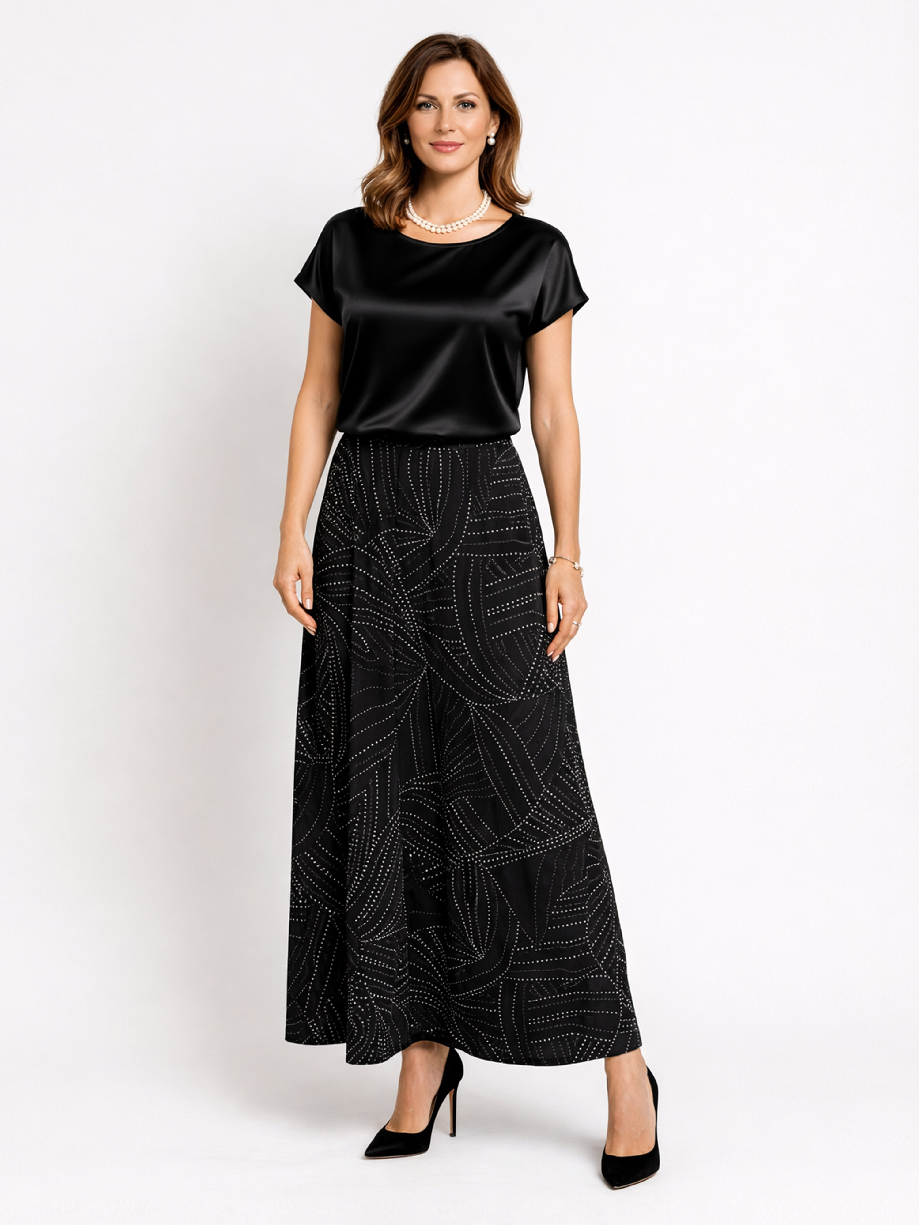 Spódnica wykonana z wysokiej jakości żorżety wiskozowej to elegancka propozycja, która łączy lekkość i wygodę. Tkanina jest miękka i przyjemna w dotyku, co sprawia, że spódnica jest wyjątkowo komfortowa w noszeniu. Czarne tło w połączeniu z subtelnym białym drukiem tworzy interesujący kontrast, nadając całości ponadczasowego charakteru.