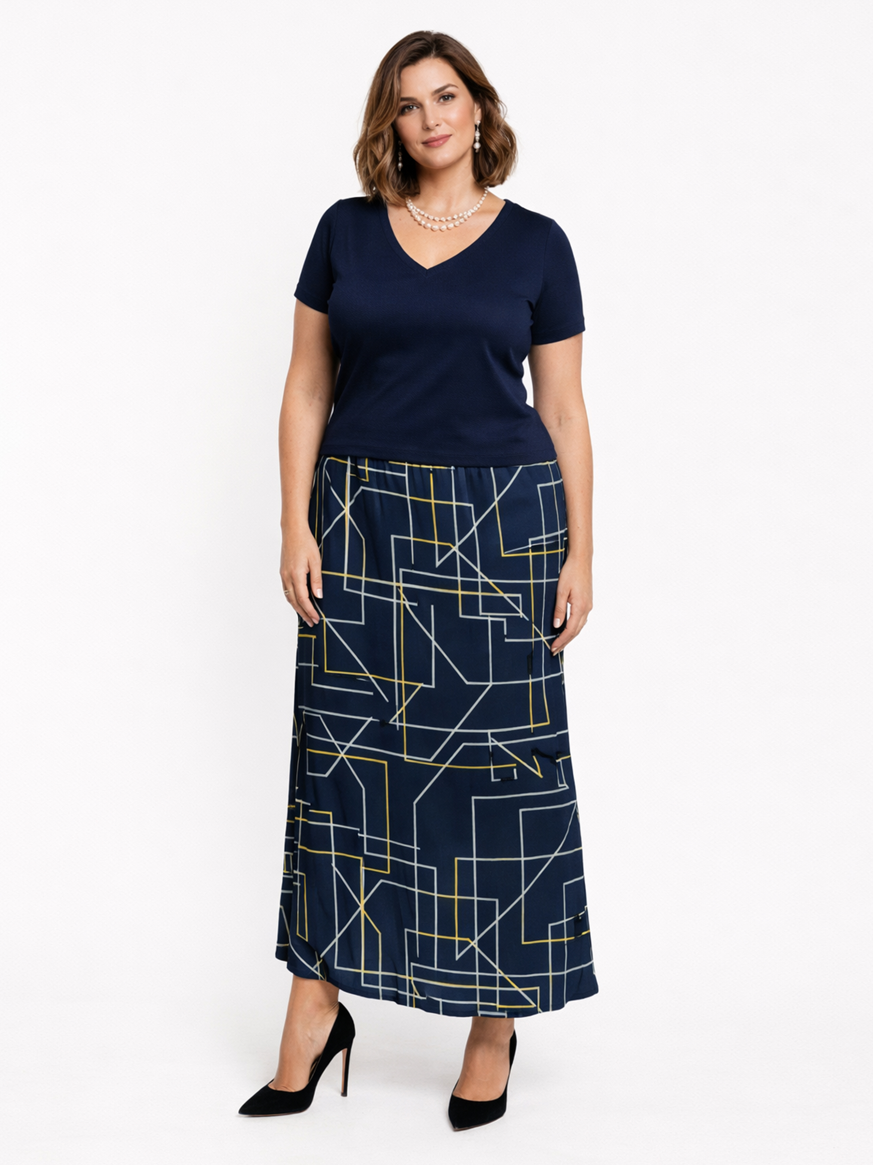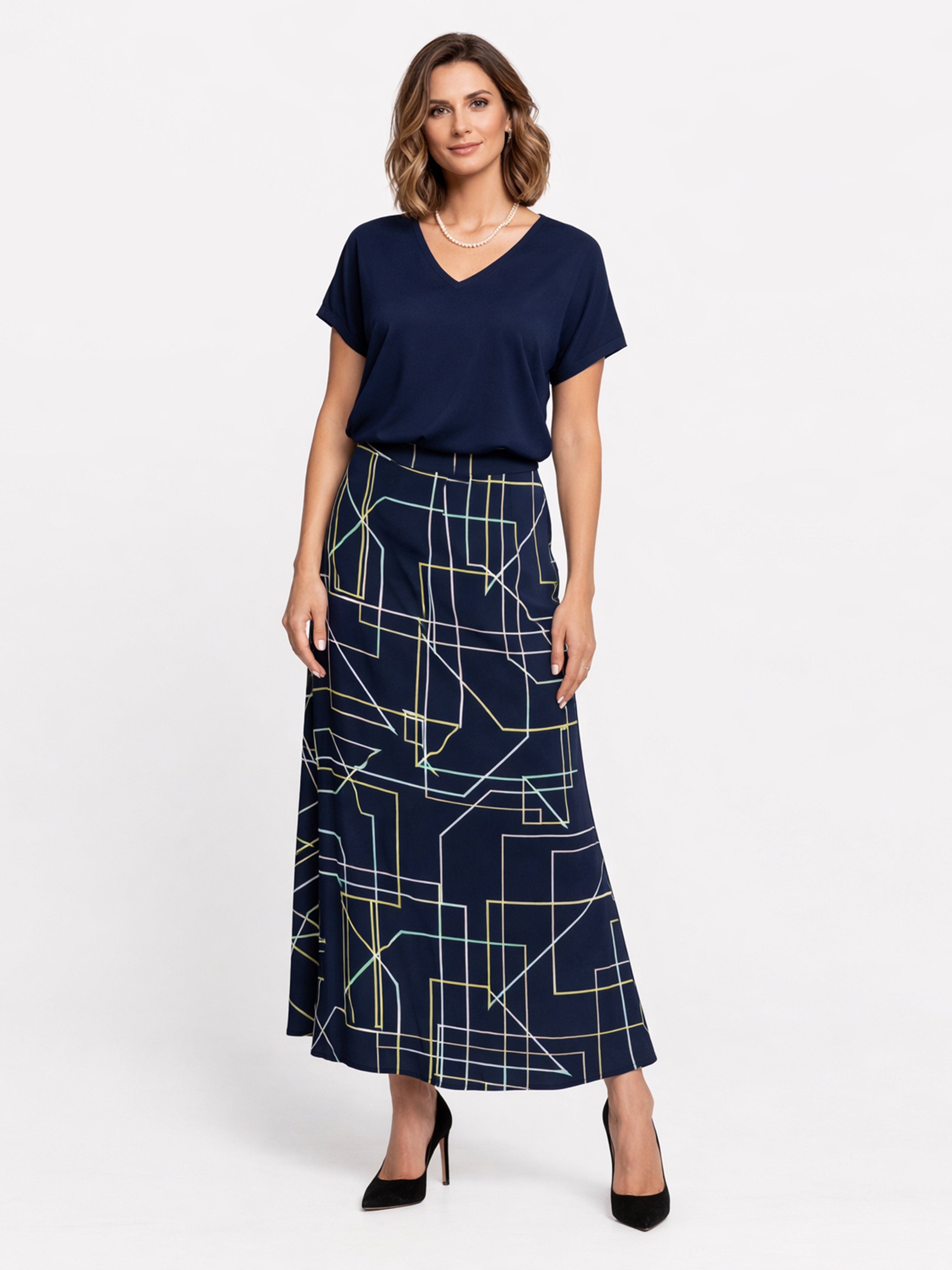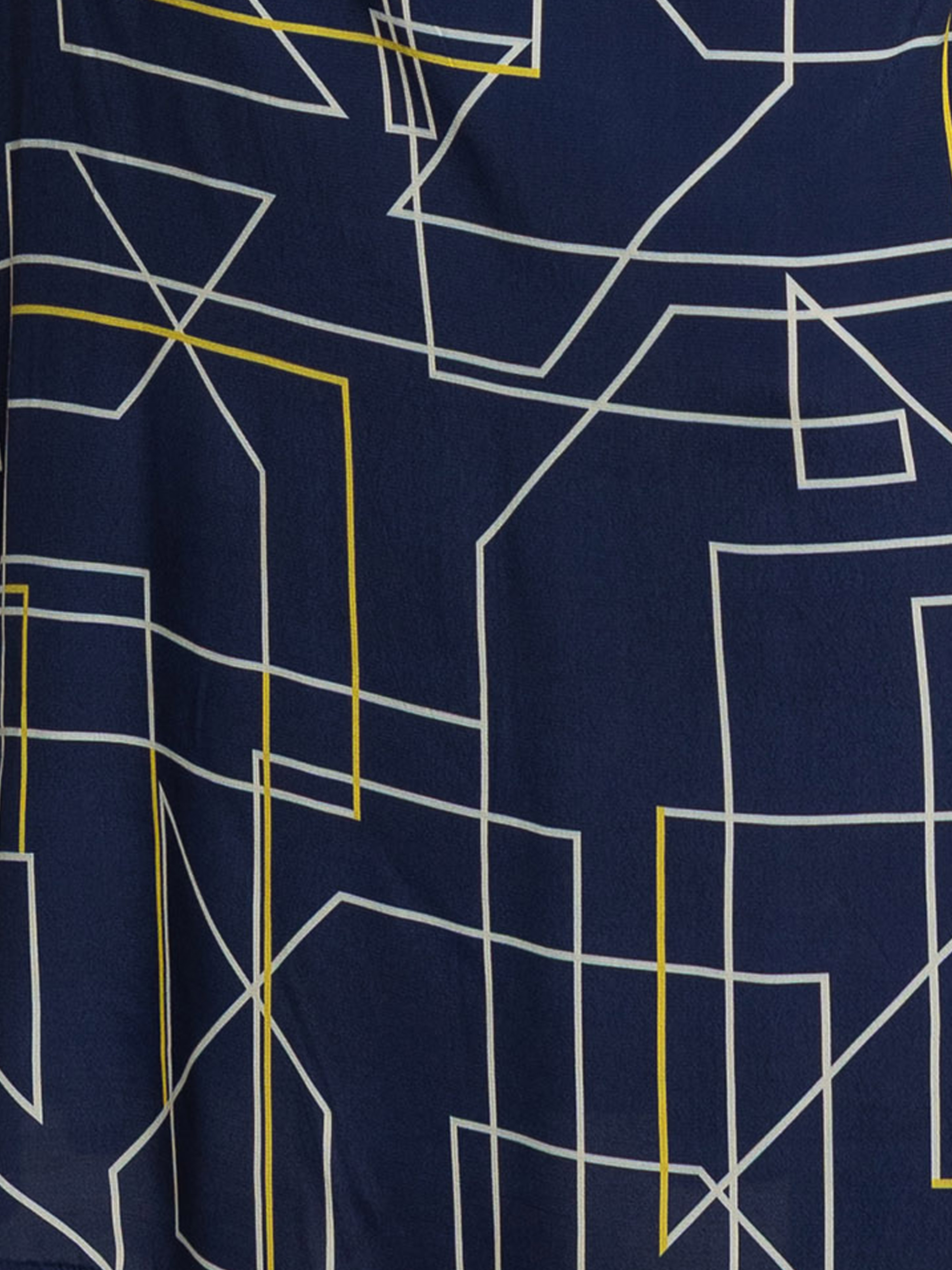 Spódnica wykonana z wysokiej jakości żorżety wiskozowej to elegancka propozycja, która łączy lekkość i wygodę. Tkanina jest miękka i przyjemna w dotyku, co sprawia, że spódnica jest wyjątkowo komfortowa w noszeniu. Granatowe tło w połączeniu z subtelnym białym drukiem z żółtymi akcentami tworzy interesujący kontrast, nadając całości ponadczasowego charakteru.