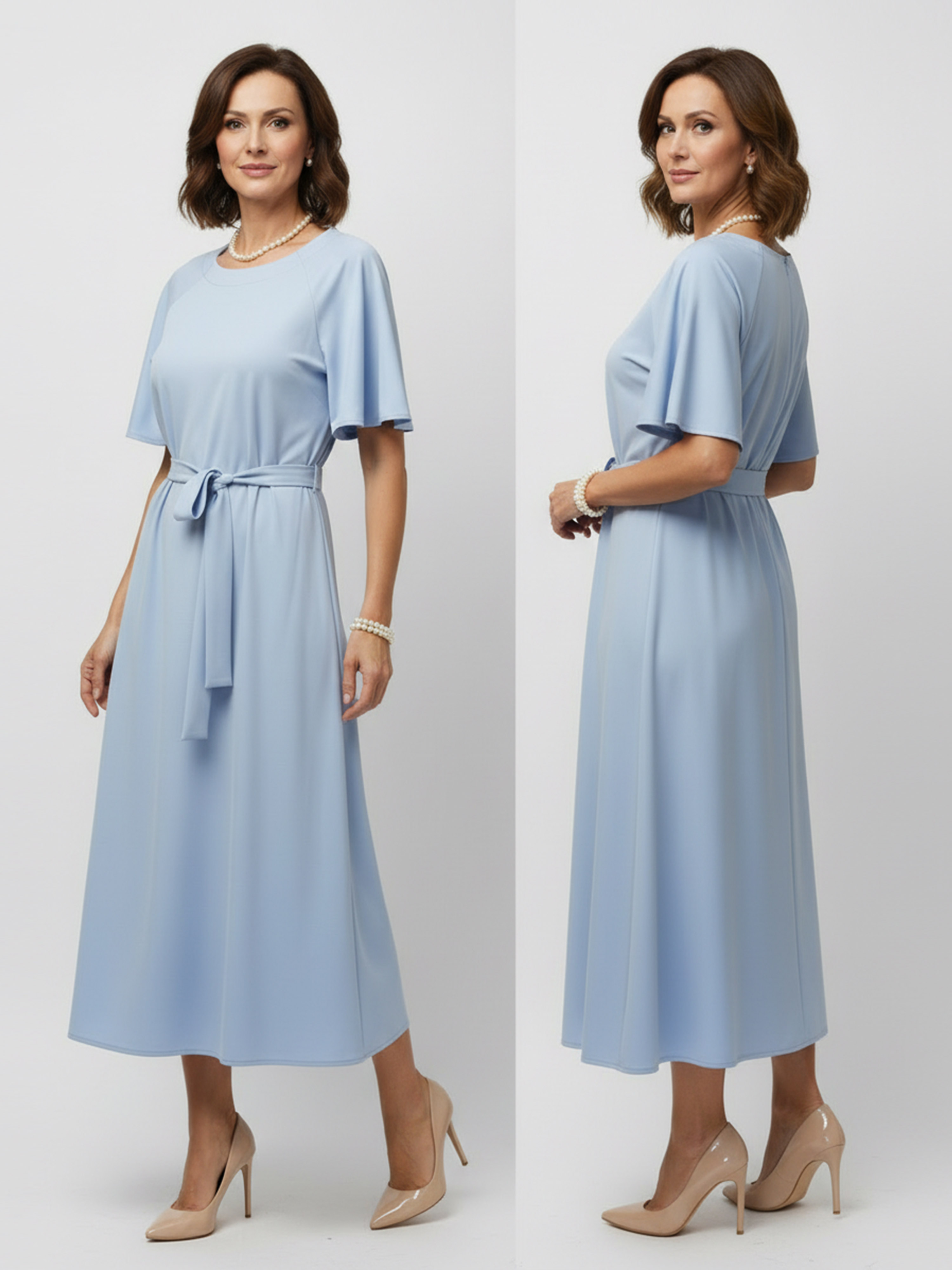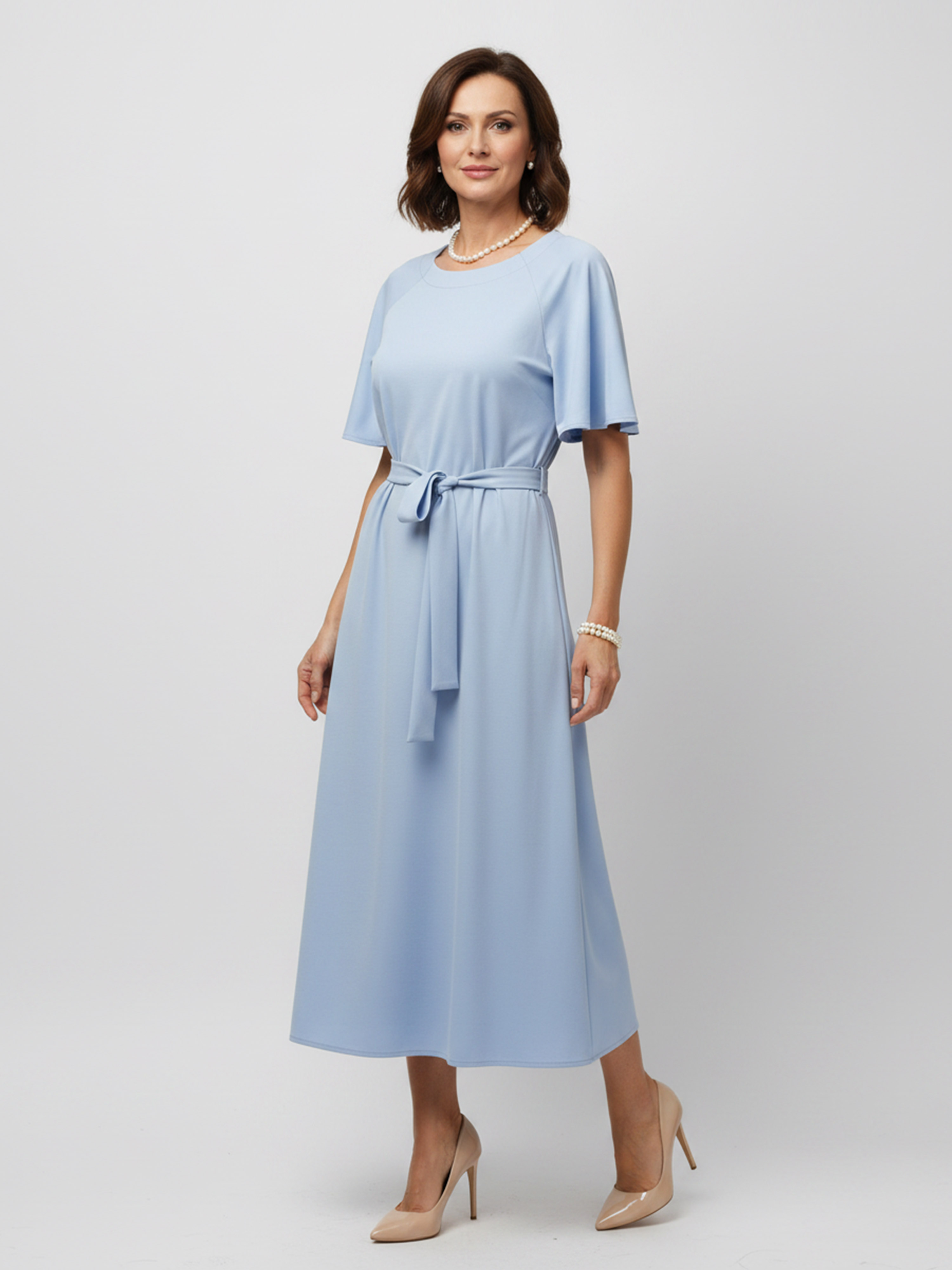 Elegancka sukienka z dzianiny wiskozowej w subtelnym, jasnoniebieskim odcieniu to doskonałe połączenie komfortu i kobiecego stylu. Wykonana z super miękkiej dzianiny o gładkiej powierzchni, jest niezwykle przyjemna dla skóry, nie gniecie się i doskonale trzyma formę, dzięki czemu zawsze wygląda schludnie i świeżo.