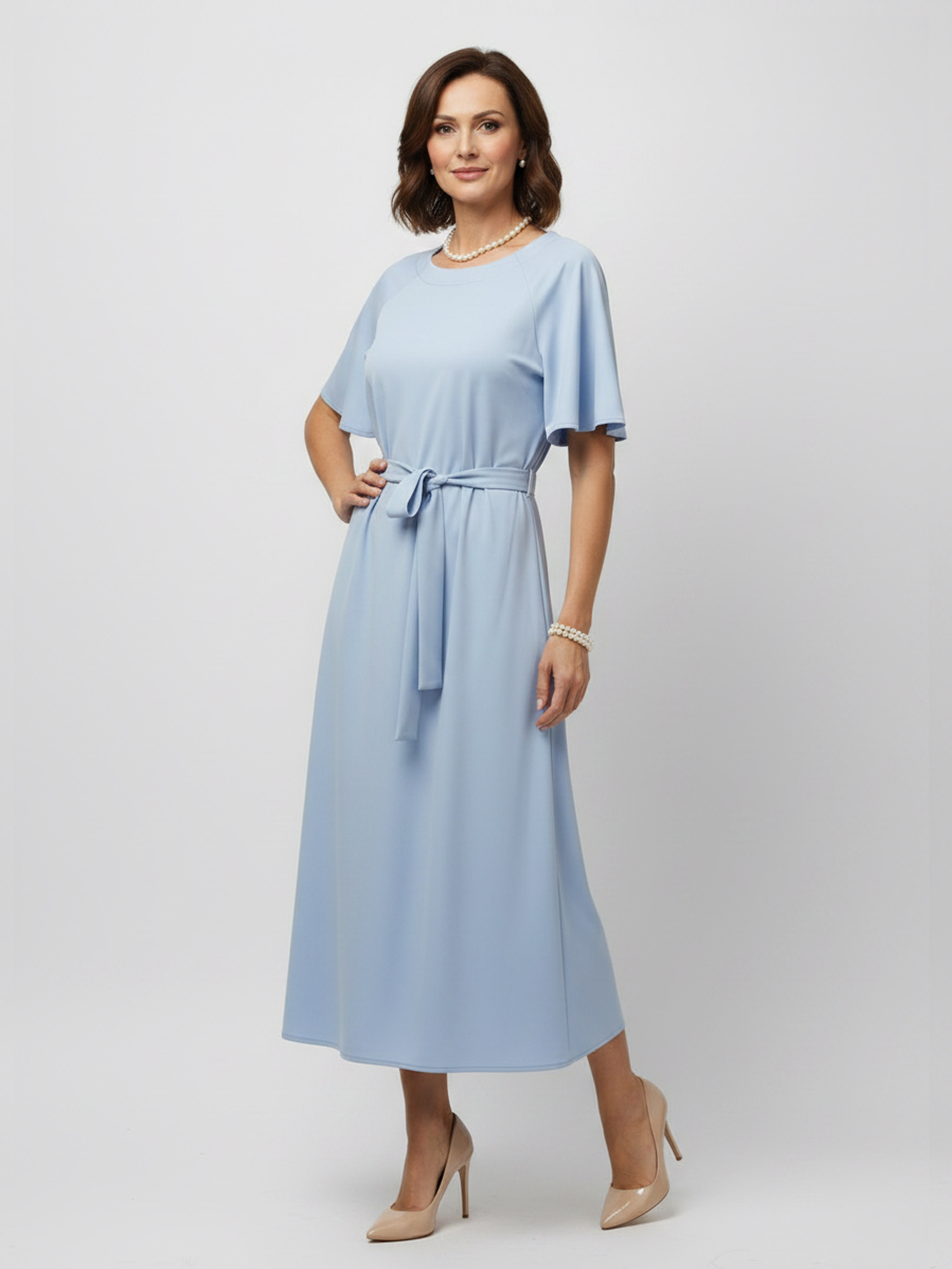 Model o lekko rozkloszowanym kroju pięknie układa się na sylwetce, zapewniając swobodę ruchów i wysmuklający efekt. W talii znajduje się pasek do wiązania, który pozwala na indywidualne dopasowanie i podkreślenie kobiecych proporcji. Klasyczny, zabudowany dekolt dodaje elegancji, natomiast krótkie, szerokie rękawy o formie kloszowej wprowadzają lekkość i subtelny, nowoczesny charakter.