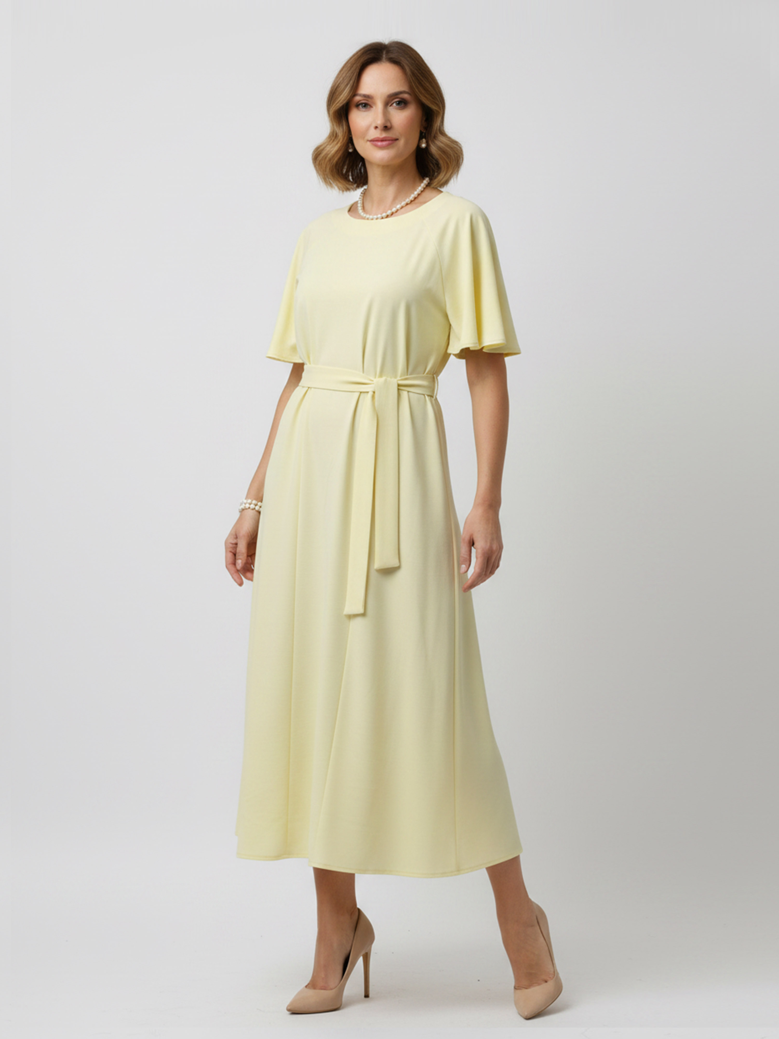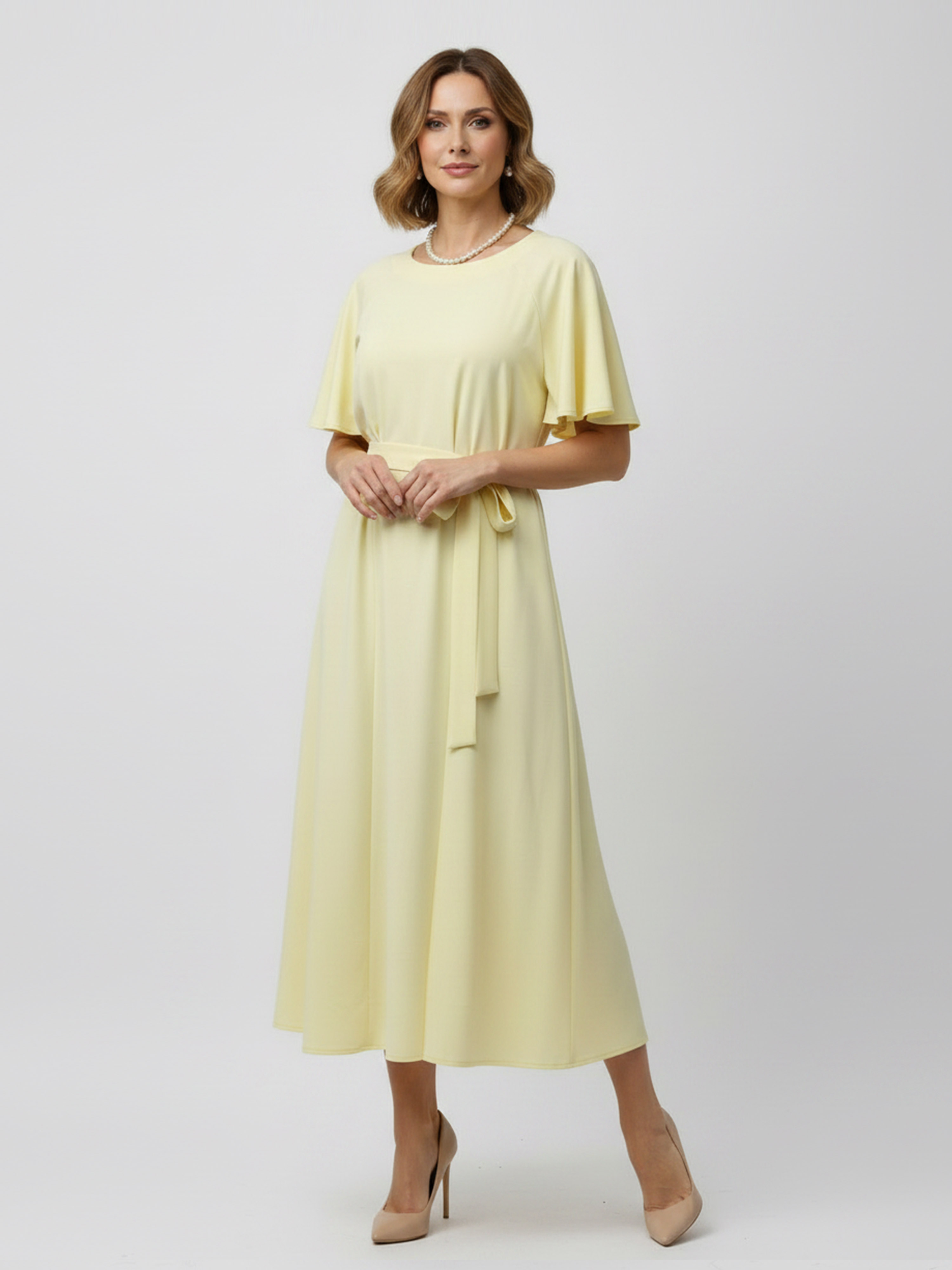 Stylowa sukienka z dzianiny wiskozowej w delikatnym, cytrynowym odcieniu żółci to idealna propozycja dla kobiet ceniących elegancję i wygodę w lekkim, świeżym wydaniu. Wykonana z super miękkiej dzianiny o gładkiej powierzchni, zapewnia wyjątkowy komfort noszenia – materiał nie gniecie się i doskonale trzyma formę, dzięki czemu sukienka prezentuje się nienagannie przez cały dzień.