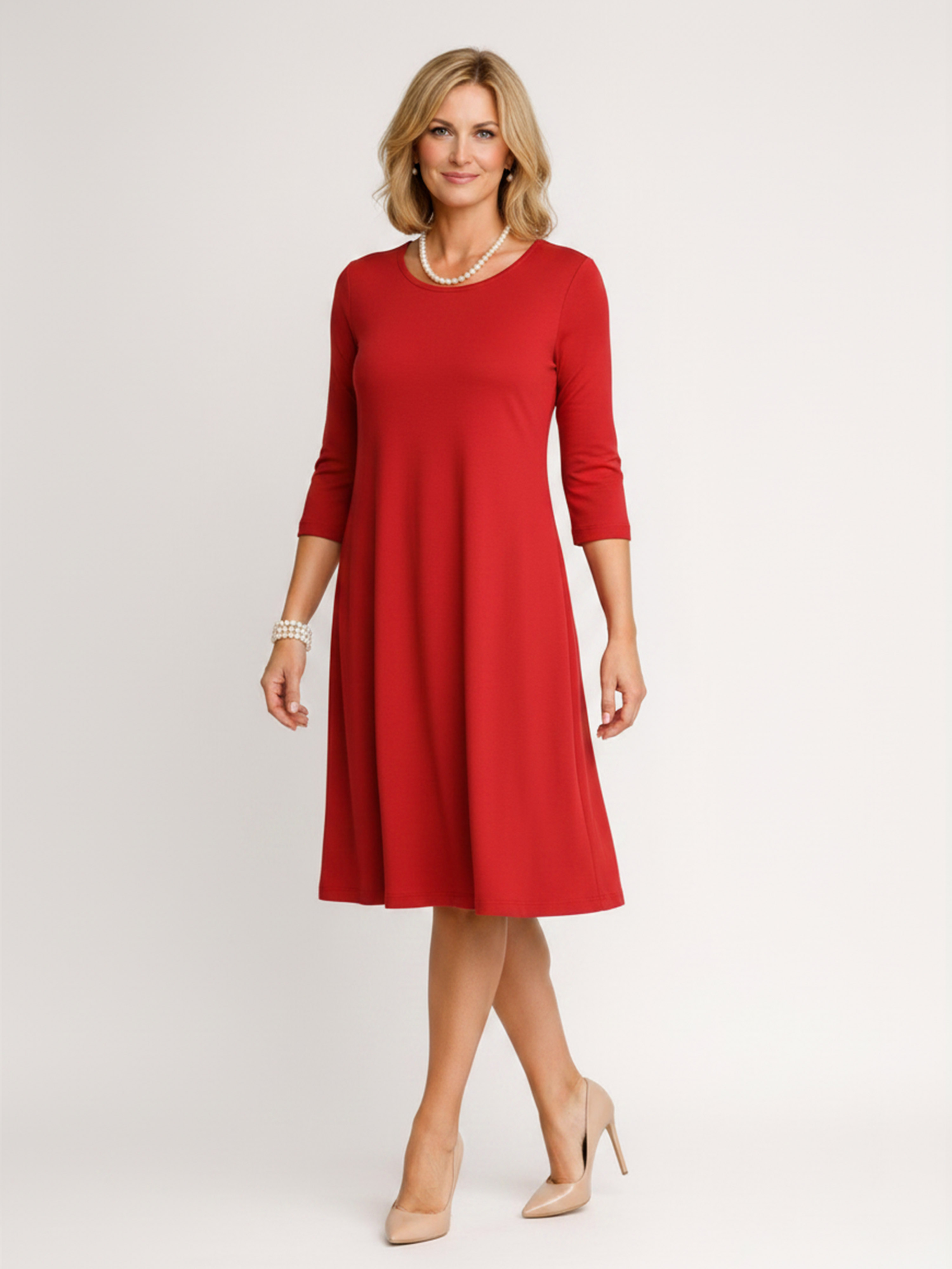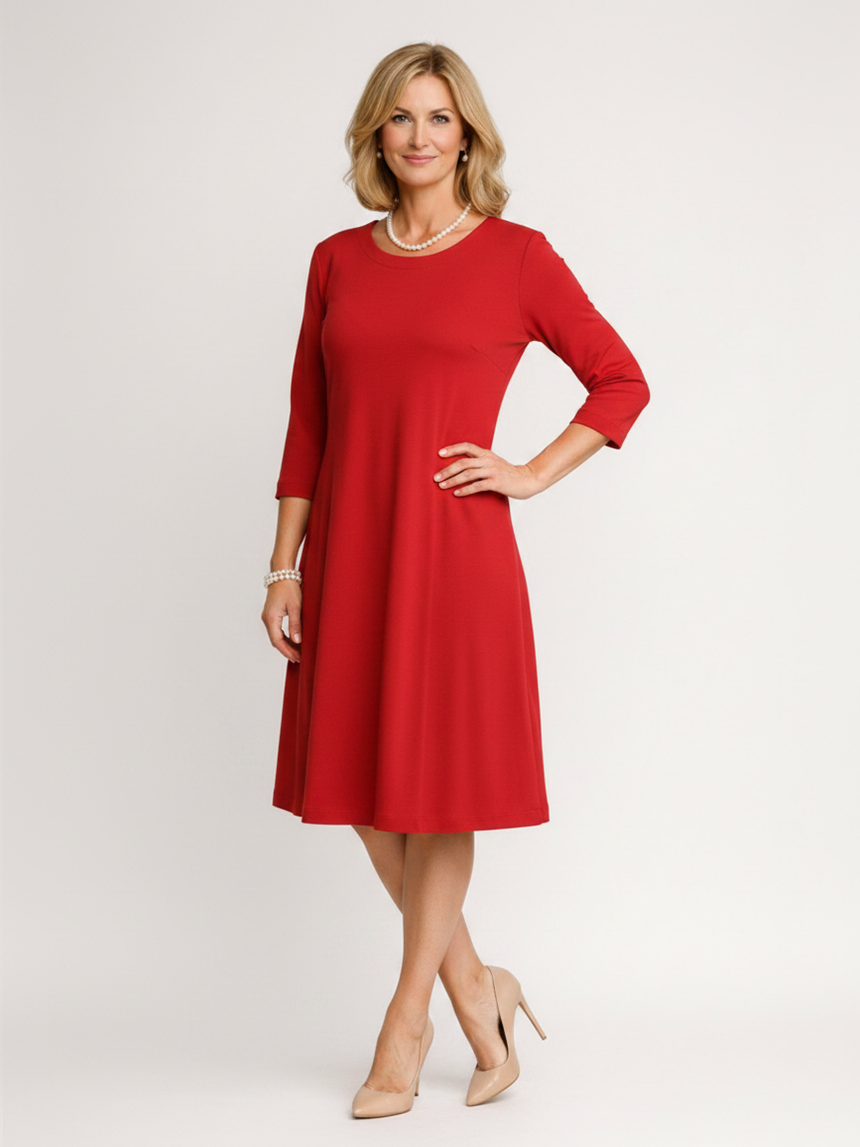 Klasyczna sukienka z dzianiny wiskozowej w intensywnym, czerwonym kolorze, która przyciąga uwagę i podkreśla kobiecy styl. Model o dopasowanej górze i lekko rozkloszowanym dole pięknie układa się na sylwetce, zapewniając jednocześnie wygodę i swobodę ruchów.